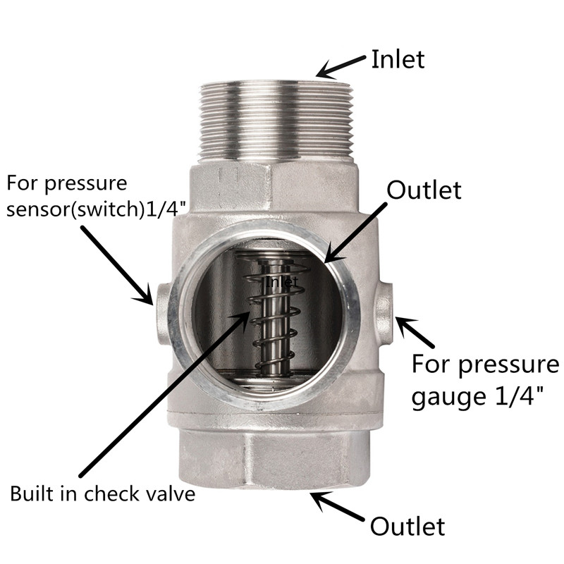 A principal característica do conector de cinco vias de aço inoxidável sem válvula de retenção fabricado pela Joepai Factory é que o próprio corpo da válvula possui cinco portas: 1" fêmea x 1" fêmea x 1" macho x 1/4" fêmea x 1/4" macho. É um componente puramente de conexão com um canal oco interno e sem partes móveis, e não possui nenhuma função de controle, como válvula de retenção ou regulação. Seu único objetivo é coletar ou distribuir fluidos. Para uma unidade de controle de sistema de bomba pequena, o conector de cinco vias atua como um compacto integrado plataforma de montagem, reunindo todos os principais componentes de monitoramento e proteção.